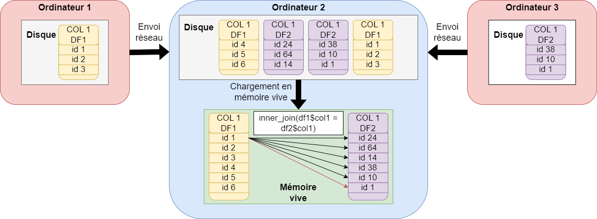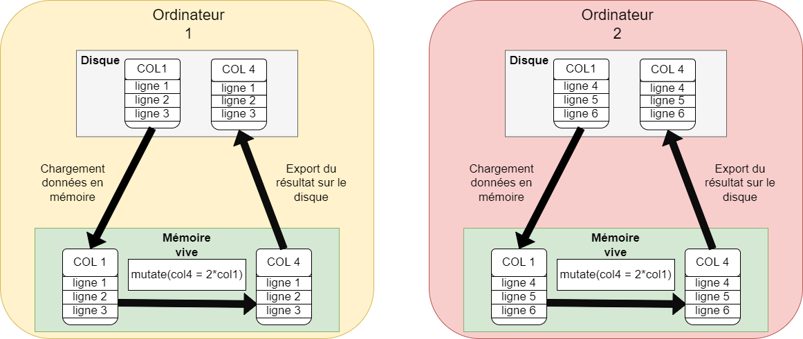 Les opérations par groupe de ligne (group_by(id)) nécessitent aussi un échange de données entre ordinateurs pour regrouper les lignes avec la même valeur de id sur le même ordinateur.
