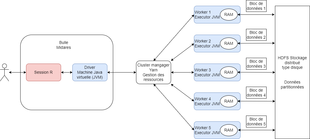 L’environnement de travail pour les données MiDAS à la Dares est un cluster spark yarn.